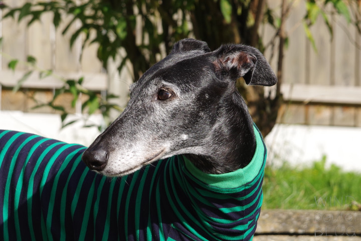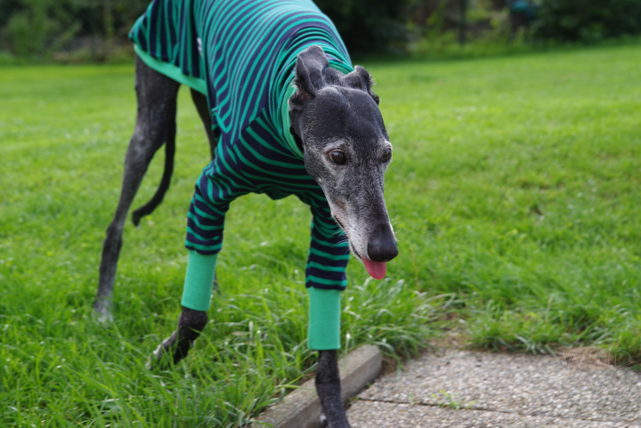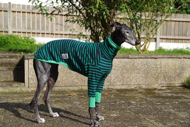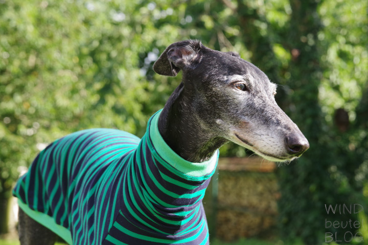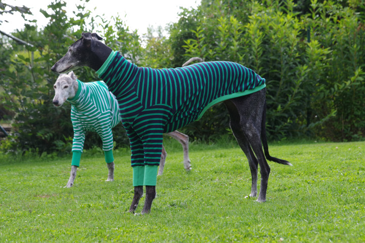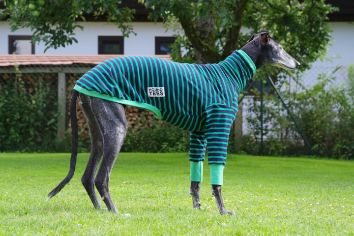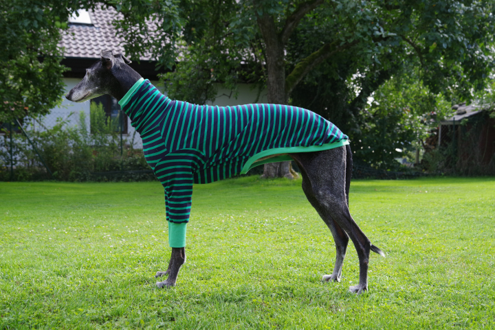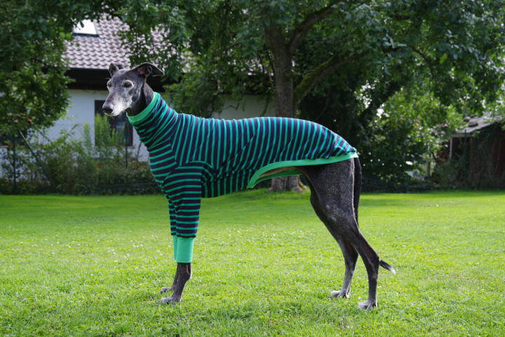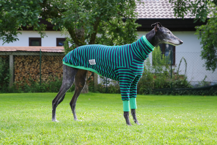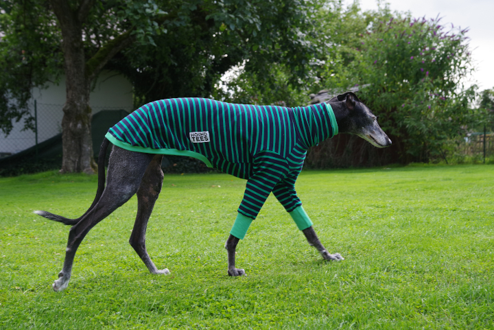 Die Windhundpullover aus Baumwolle in den lustigsten Mustern aus Australien sind momentan der Renner unter Windhunden. Nahezu für alle Rassen verfügbar in den verschiedensten Designs. Als Unterwäsche sind sie super unter einem Wintermantel zu tragen und es sieht witzig aus, wenn geringelte Beine unter einem Mantel hervorgucken. Nun mal die Bilder von Ely in ihrem Houndtee, Modell „Kermit“ von Caluchi-Petshop