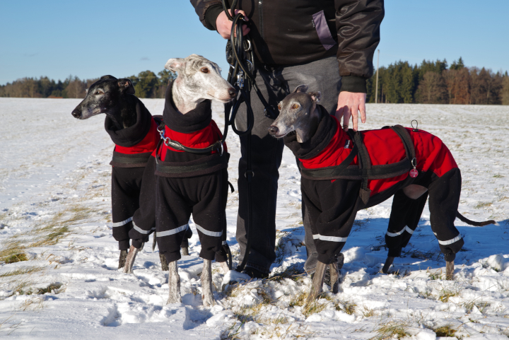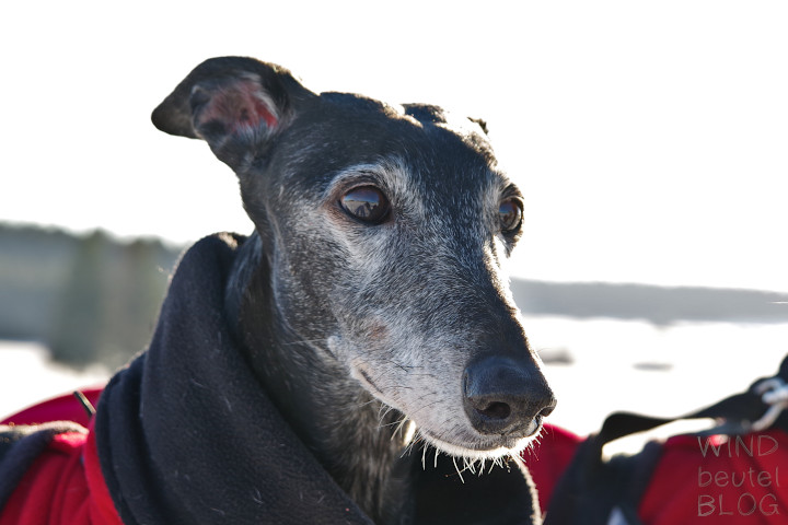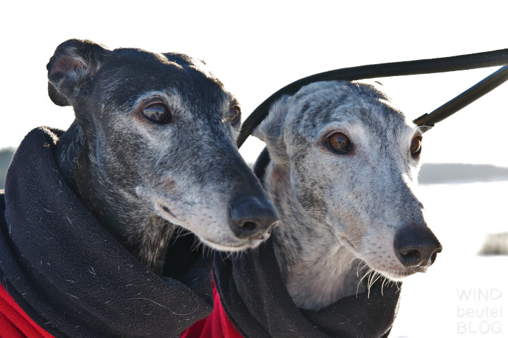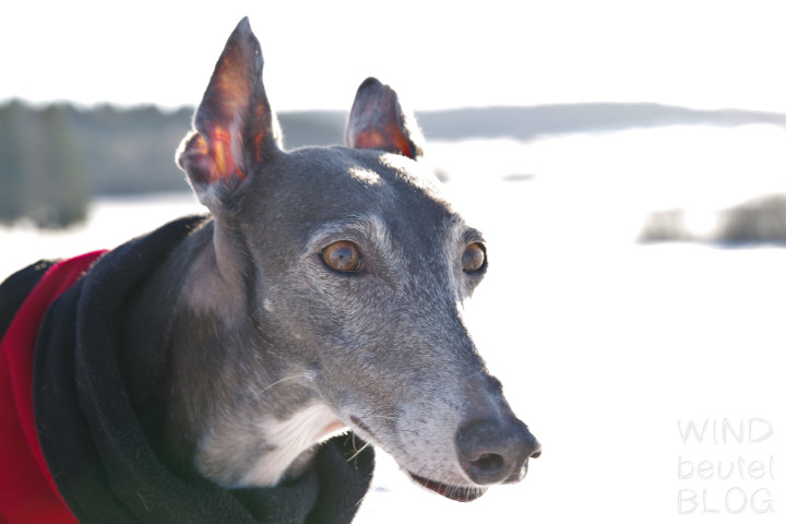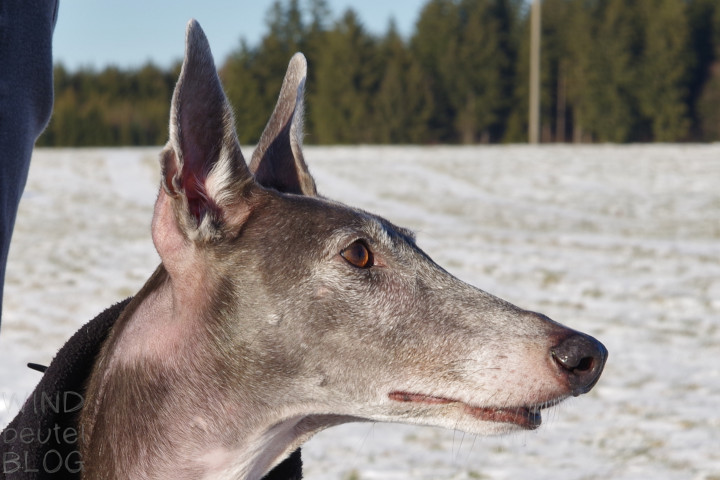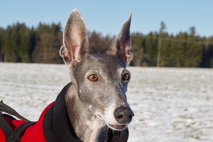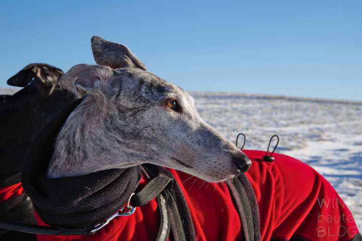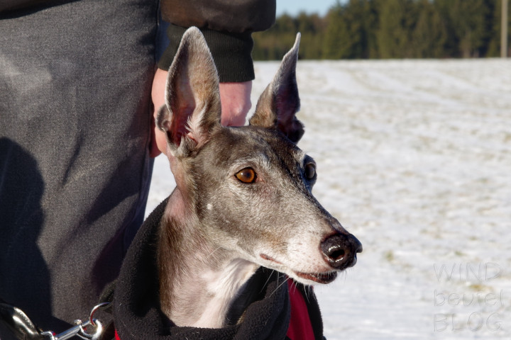 Stundenlang, aktuell in den verschiedensten Auto’s sitzen und herum gefahren werden, kennen wir ja schon. Aber das ich bei diesem kalten Winterwetter so viel Spaß haben werde, hätte ich niemals gedacht. Als ich aus dem Auto ausstieg war gleich Whippet-Alarm. Ich schrie vor Freude was meine Stimmbänder her gaben und vollführte wilde Freudentänze an der Leine. Mit Sicherheit erwartet uns nun wieder ein typischer Windhundspaziergang mit Leinenzwang für die „gefährlichen Jagd-Galgo’s“ und das Whippchen darf unbegrenzt Spaß haben. Ich schnüffelte hier, schüffelte da – überquerte den Weg, lief vor und lief zurück. Warum geht das so einfach? Wo ist eigentlich der Leinenträger? HAAA – ich habe ja gar keine Leine mehr dran. Dann folgt nun die Whippet-Galgo-Party!